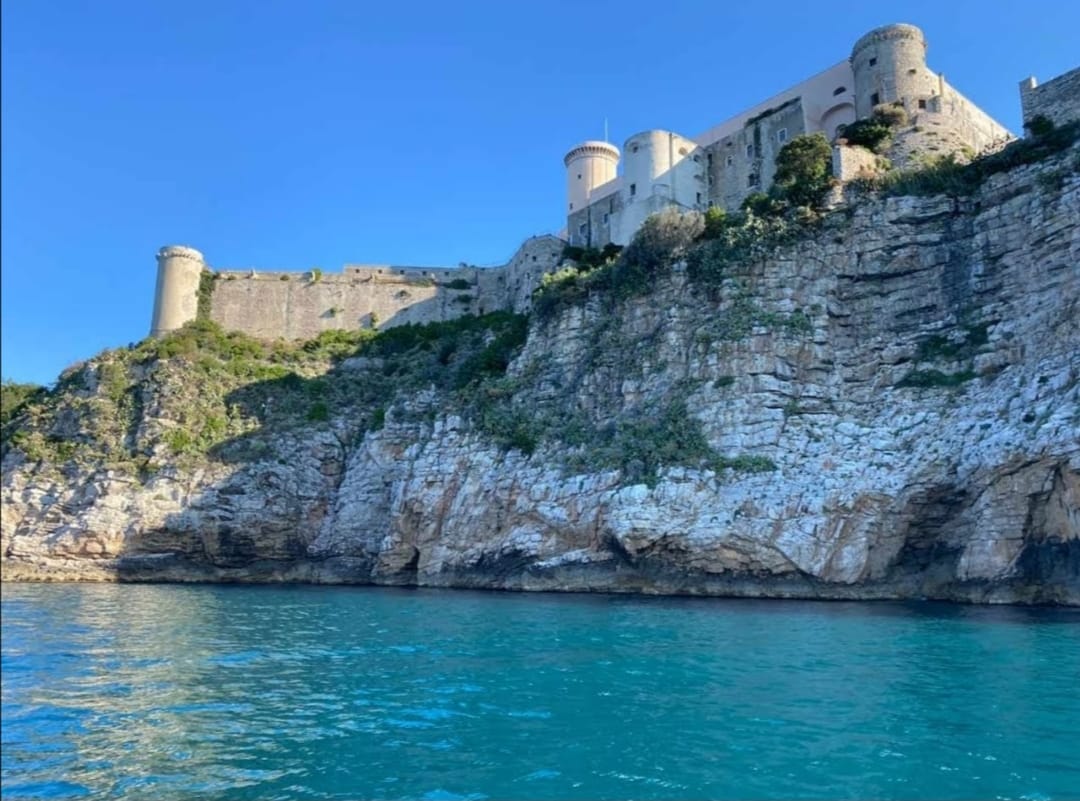 Ammireremo dal mare l'imponente Castello Angioino-Aragonese fino a raggiungere la punta estrema del promontorio, dove la roccia si apre nel solenne Santuario della Montagna Spaccata e nella leggendaria Grotta del Turco. Qui, la Cappella del Crocifisso sfida le leggi della fisica, restando sospesa tra le falesie sopra un mare di un blu cobalto indimenticabile.